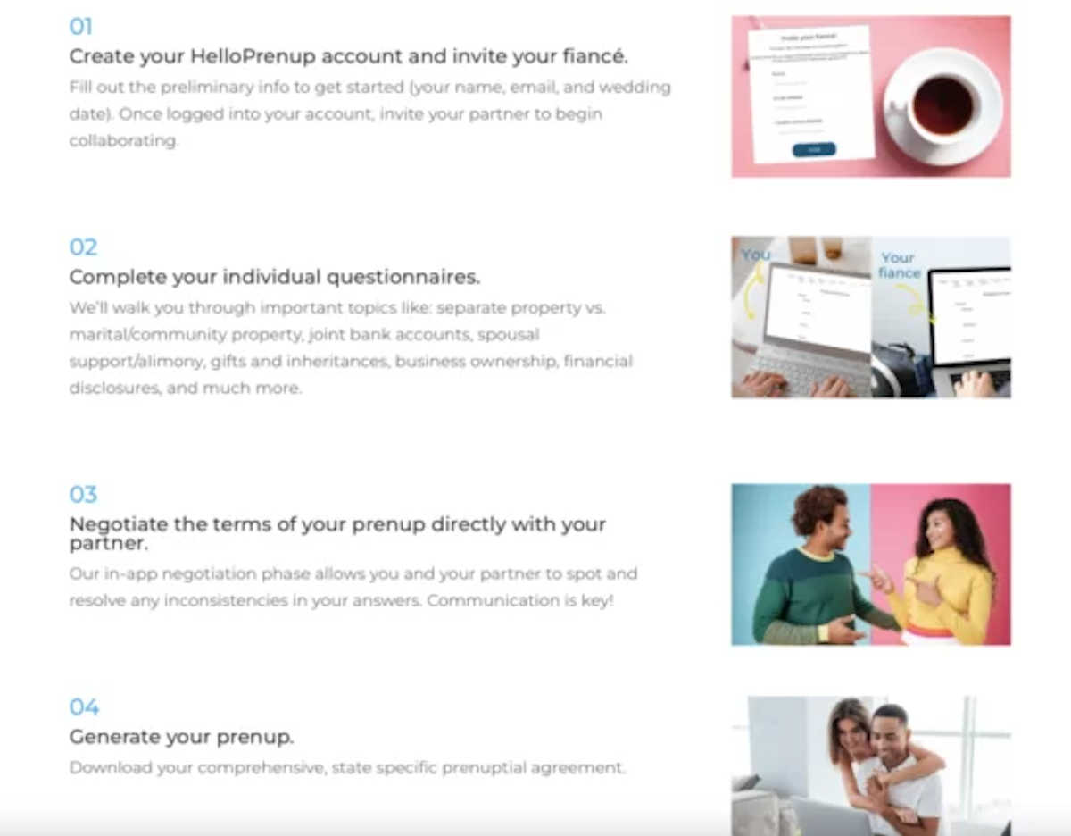 - Primero, creará una cuenta Hello Prenup ingresando información preliminar como su nombre y fecha de boda. Luego, invitarás a tu pareja. Ambos deberán completar cuestionarios individuales sobre cómo desean manejar asuntos financieros importantes.
