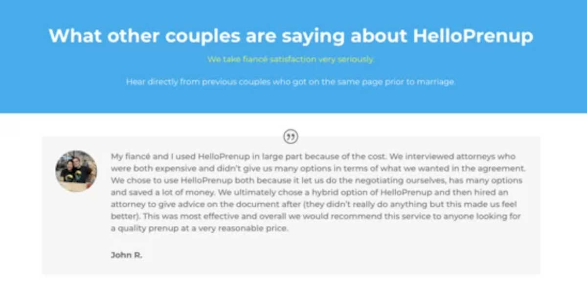 Hola acuerdo prenupcial También tiene muchas reseñas de parejas muy felices y satisfechas.. Los revisores han dicho que la plataforma es ágil, fácil de usar y ayuda a que las discusiones financieras sean menos incómodas. Las parejas también quedaron impresionadas con el precio y la relación calidad-precio. Una pareja incluso hizo que un abogado revisara su acuerdo prenupcial para verificar su exactitud. Dijeron que su abogado no hizo cambios, lo que demuestra lo fantástico que es este servicio.