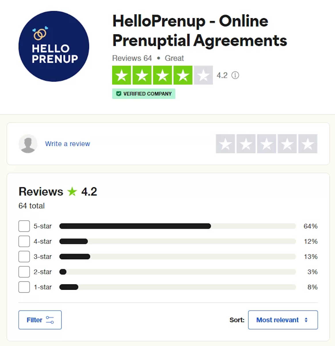 Las revisiones independientes de Hello Prenup también son generalmente favorables. Aquí hay un resumen de TrustPilot.