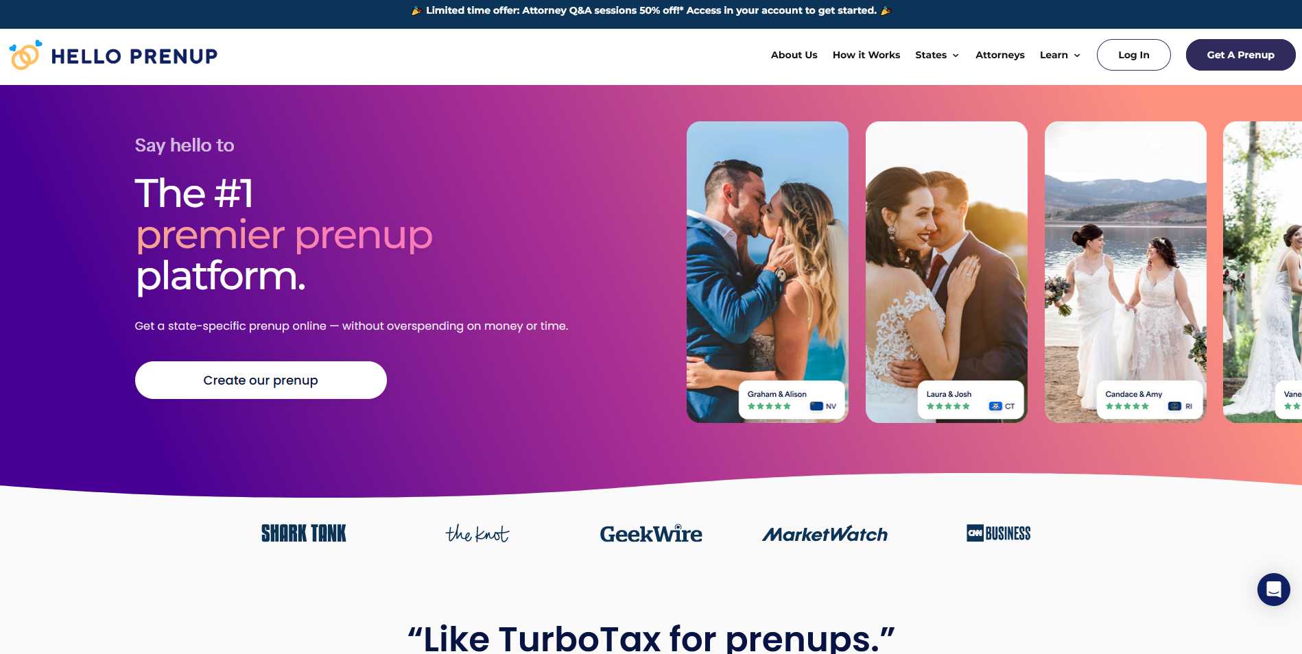 La verdad es que el matrimonio no es fácil. Sin embargo, un acuerdo prenupcial es una buena manera de evaluar posibles problemas antes de casarse. Hello Prenup también tiene la ventaja de ser económico, legalmente vinculante y en gran medida automatizado. Para la mayoría de las personas, es una alternativa eficiente y rentable a contratar a un abogado. Si aún no está convencido, las reseñas de Hello Prenup hablan por sí solas. Si esta le parece la decisión correcta, puede lograrla a través de este enlaceo haga clic en el botón a continuación: