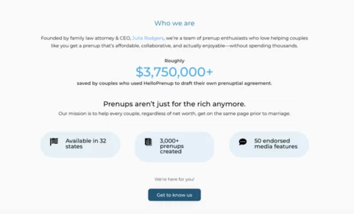 Hello Prenup cobra una tarifa fija de $599 por pareja. Según datos de US News & World Report, contratar a un abogado cuesta alrededor de 2.500 dólares por persona.