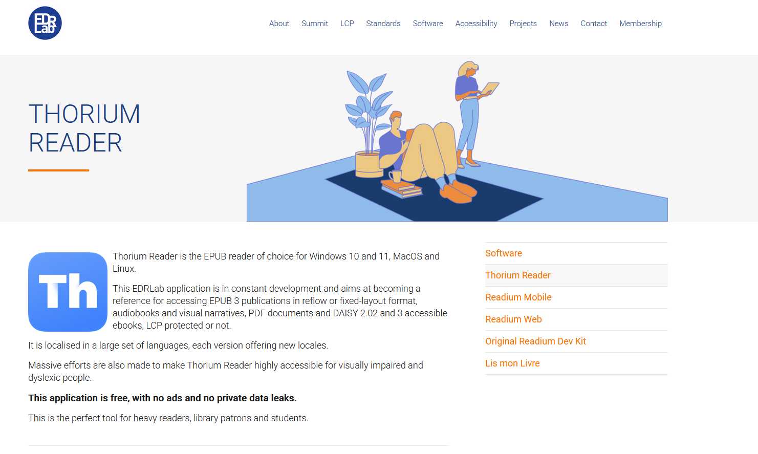 Thorium Reader es un lector de EPUB gratuito y de código abierto desarrollado por EDRLab, diseñado específicamente para ofrecer una experiencia de lectura moderna y accesible. Es compatible con los formatos EPUB 2 y EPUB 3, incluyendo libros electrónicos protegidos con DRM (LCP).